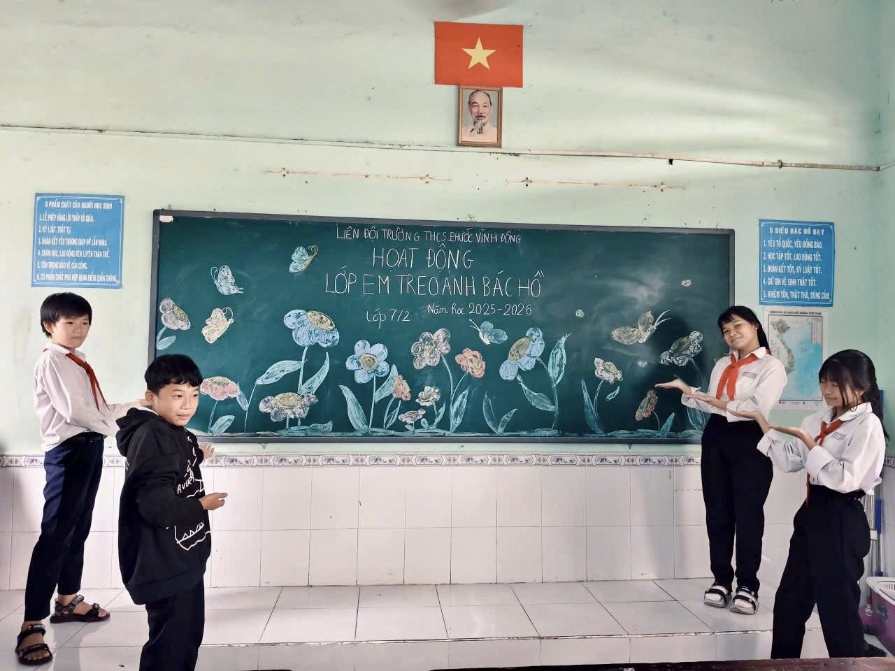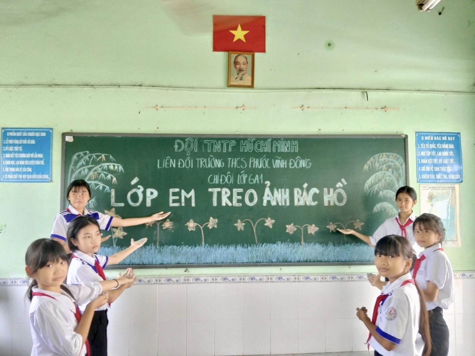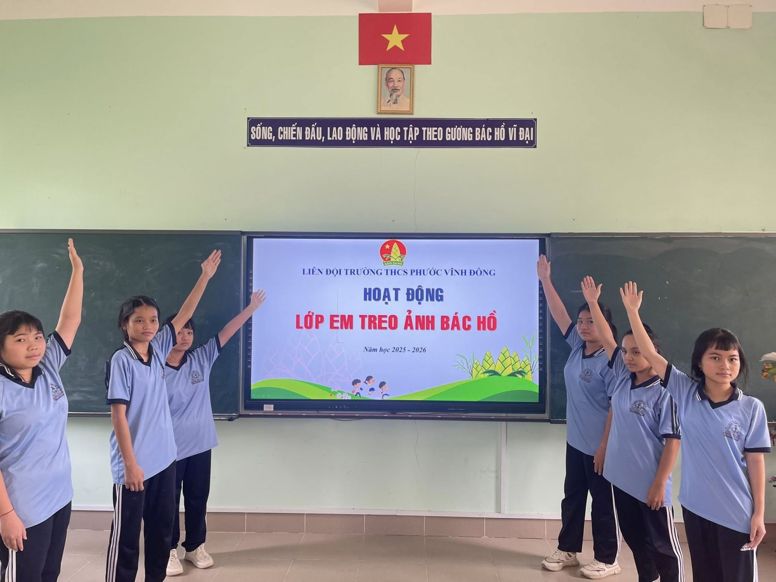 Thực hiện Chương trình công tác Đội và phong trào thiếu nhi năm học 2025-2026, Liên đội trường THCS Phước Vĩnh Đông tiếp tục duy trì hoạt động “Lớp em treo ảnh Bác Hồ” tại 100% các lớp học.