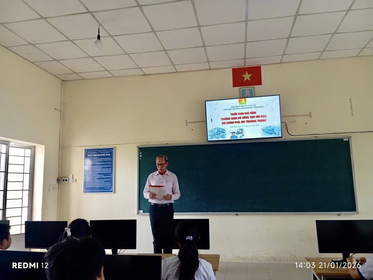 Ngày 21/01/2026 Liên đội Trường THCS Phước Vĩnh Đông phối hợp với Nhà trường và Đoàn xã Tân Tập tập huấn và triển khai mô hình “Không gian số sáng tạo-Em học, em khám phá, em trưởng thành”.