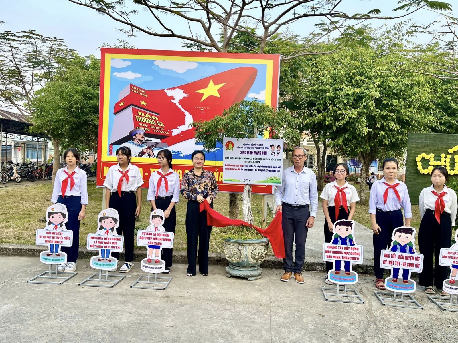 Trong không khí trang trọng và phấn khởi, Thầy Đặng Ngọc Hiếu-Hiệu trưởng và Cô Trần Thị Mười-Phó Hiệu trưởng đã thực hiện nghi thức tháo băng ra mắt mô hình, chính thức đưa Công trình Măng non “Chi bi tuyên truyền” vào hoạt động.